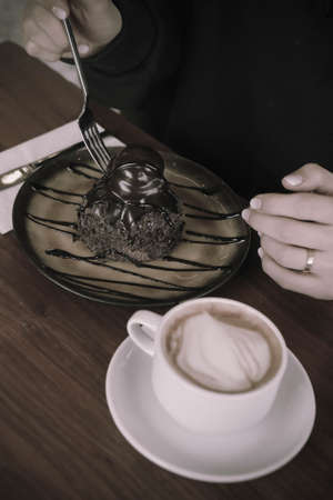 Cropped photo of blurred woman pouring milk cream in coffee, eating brownie cake. Cafe holiday pleasure, close up