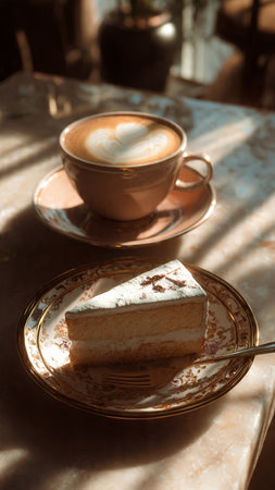 Coffee cup and slice of cake on saucer in sunlight