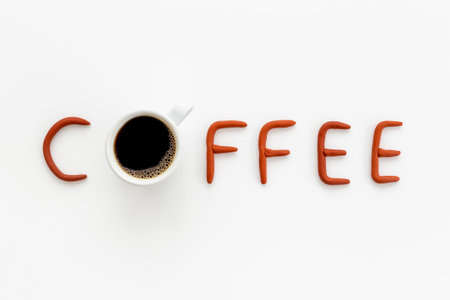 White cup of hot black coffee with rubber letters. Coffee break concept