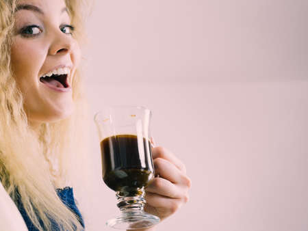 Positive woman holding black coffee about to drink. Getting morning energy, hurry up before going to work.