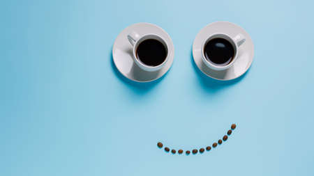 Two white cups of black coffee and coffee beans creating a smiley emoticon isolated on a light blue background. Happy morning and good mood. Creative drink concept with blank copy space. Flat lay.