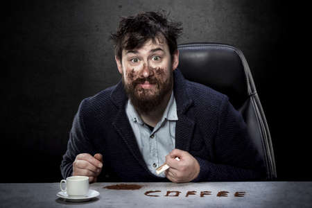 bearded man smeared with coffee, looking madly at the camera, the concept of coffee is a drug
