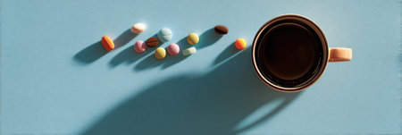 A coffee cup sits atop a blue surface, surrounded by bright pills that have spilled out, casting interesting shadows, inviting reflection on health topics.