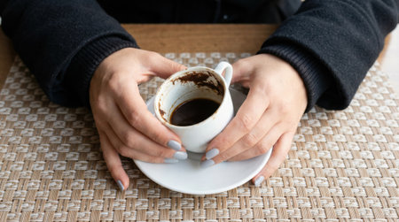 Close-up view of a persons hands holding a small cup with coffee grounds, a practice known as tasseography or fortune telling, to predict the future.