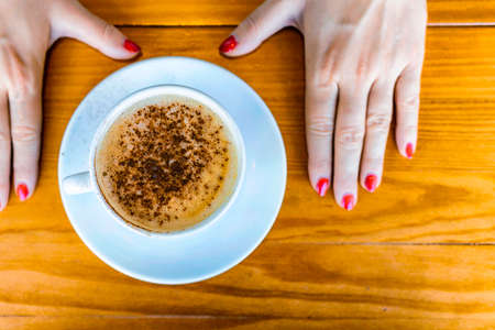 Hands of young woman holding a cup of coffee seen through cafe window