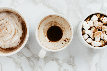 Flatlay of three white cups of vegan cacao with various toppings on marble background