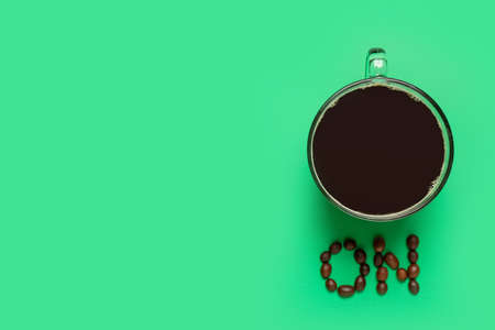 Cup of coffee and word ON on color background