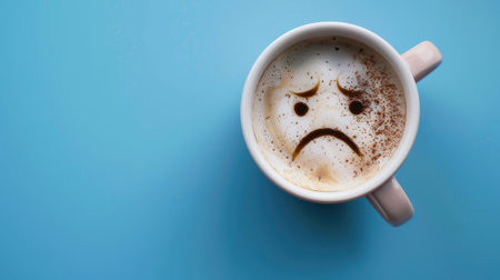 Sad face drawn on coffee milk foam, adorning a coffee cup, Ai Generated.