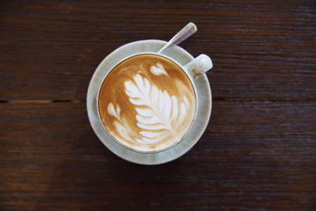 coffee latte art on wood table in cafe, selective focus top view.