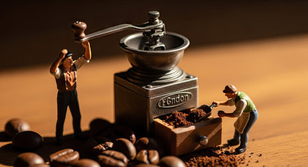 Miniature figures interact with a coffee grinder and beans in this studio shot. The scene displays a warm, brown color palette with careful lighting. The detailed composition focuses on the close-up of the subject, suggesting potential uses in advertising or editorial design. The environment is indoors and implies preparation.