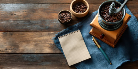 Coffee grinder and beans with notepad and pen on wooden table, cozy morning scene