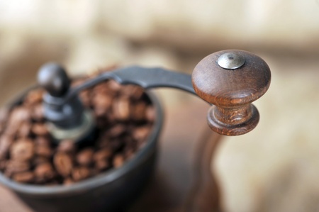 Ancient, hand-held coffee grinder with coffee beans