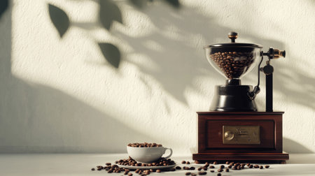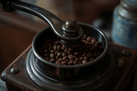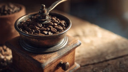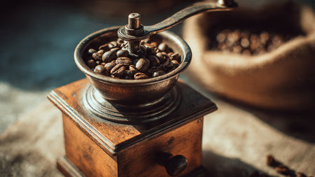 Discover the art of coffee preparation with a vintage grinder, capturing the essence and aroma of freshly ground beans, perfect for coffee enthusiasts and relaxing mornings.