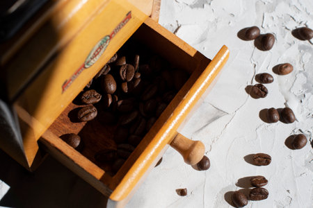 Antique coffee grinder filled with dark roasted coffee beans, ready to be ground, displayed in warm lighting. Captures a sense of traditional coffee preparation.