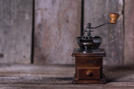 Coffee grinder on wood table background
