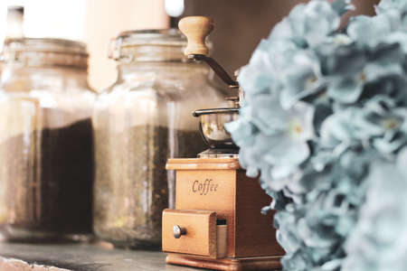 hand manual coffee grinder for espresso is antique, coffee business of vintage, closeup and selective focus, copy space