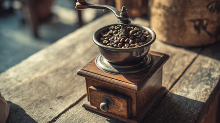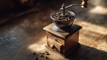 A vintage coffee grinder sits on a wooden table, ready to grind fresh coffee beans for the perfect cup