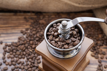 Manual coffee grinder with coffee beans on a brown wood