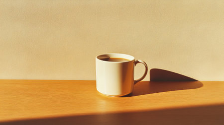 A serene morning scene featuring a cobalt ceramic mug brimming with rich brew, its elongated shadow stretching across a textured tabletop bathed in gentle daylight.