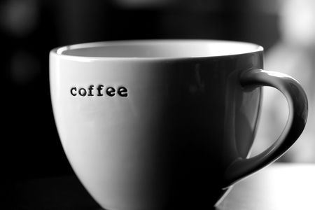 Black coffee cup on table with shadow from blinds. Black and white photo.
