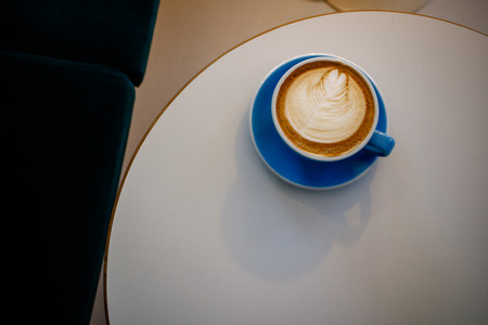 Blue Coffee Cup with Latte Art on Wooden Table in Cozy Cafe, Blurred Interior Background