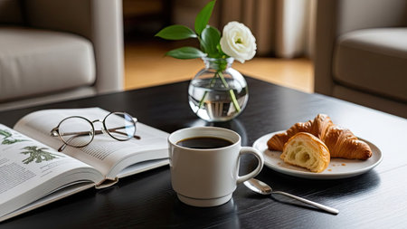 A serene living room setting with a wooden table featuring a cup of coffee, a stack of books, and a potted plant, surrounded by comfortable furniture and soft lighting.