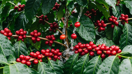 Fresh coffee cherries on a tree being watered on a rainy day.