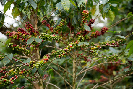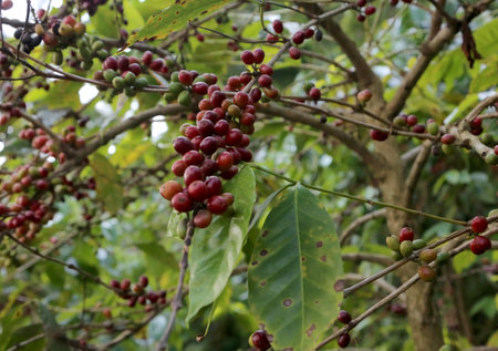 Coffee beans ripening on a tree in a coffee plantation
