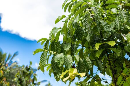 coffee tree plantation. Organic coffee growing in tropical garden.