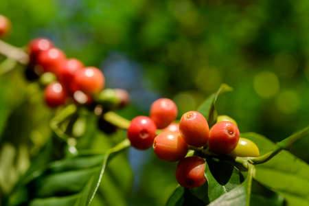 Close up fresh organic red raw and ripe coffee cherry beans on tree plantation