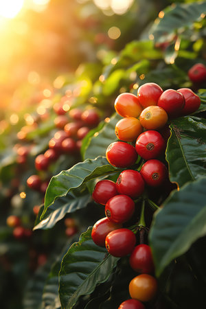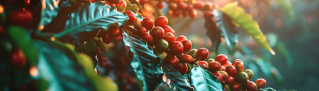 Coffee beans ripening on lush green plants, early morning sun softly illuminating the vibrant reds and oranges