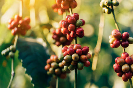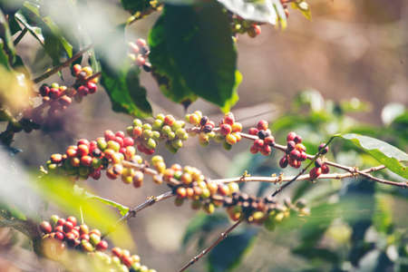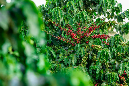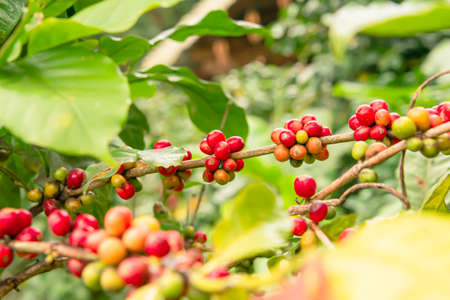 Coffee beans on a branch of tree.Red and green arabica coffee beans ripening on tree in coffeee plantation.