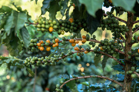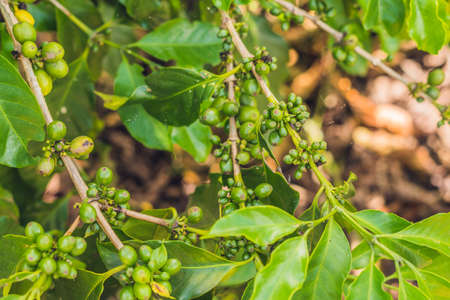 Arabica coffee tree with green ripening coffee cherries berries on plantation, coffee beans production