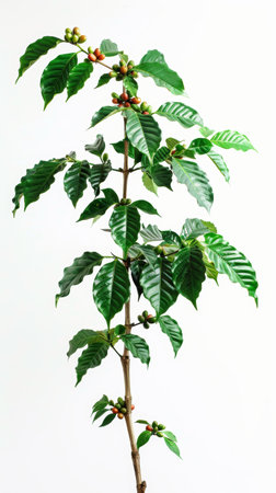 A coffee tree showcases lush green leaves and small cherries, highlighting its growth against a clean, white backdrop that enhances details.