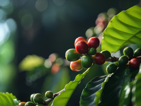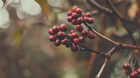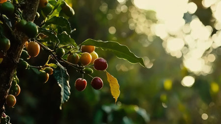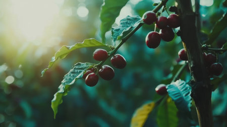 A close-up view of ripe coffee cherries hanging from a tree branch, basking in the warm glow of sunlight. This vibrant scene captures the essence of organic farming and nature's beauty.