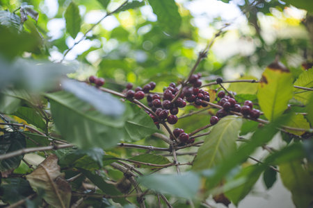 Coffee tree with ripe berries on farm