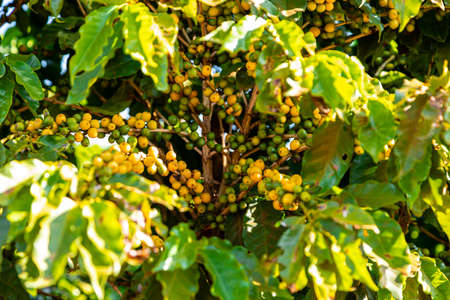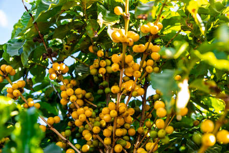 Yellow coffee bean berry plant fresh seed coffee tree growth in Yellow Bourbon eco organic farm. Close up yellow ripe seed berries harvest arabica coffee garden. Fresh coffee bean green leaf bush