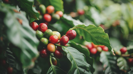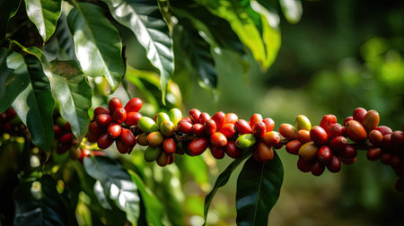 AI Generated. Bright coffee cherries ripening on the branch surrounded by lush green leaves