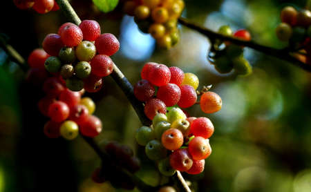Coffee beans ripening on a branch in the garden.