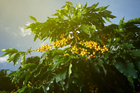Yellow cherry coffee beans in the garden And natural dark coffee tree leaves