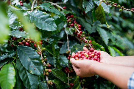 Farmer concept harvest fruit ripe coffee seed robusta arabica berry close up fresh green leaf bean picking orange crop red yellow berries raw plant tree farm growth blur background eco organic garden
