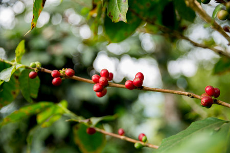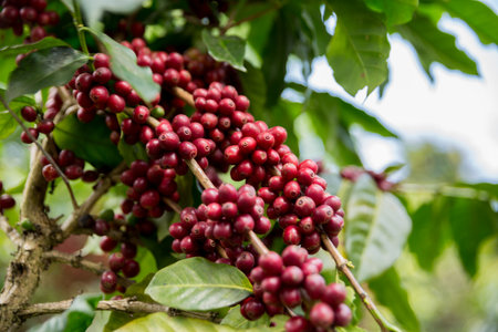 In the cool, misty highlands, a coffee branch hangs heavy with perfectly ripe, crimson cherries.