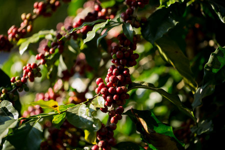 Coffee trees and fruits at plantation in sunny day.