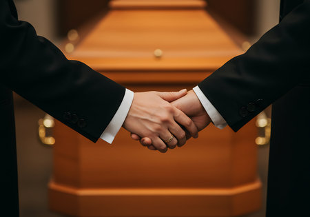 Two people holding hands in a moment of shared grief and support at a funeral. Generative Ai