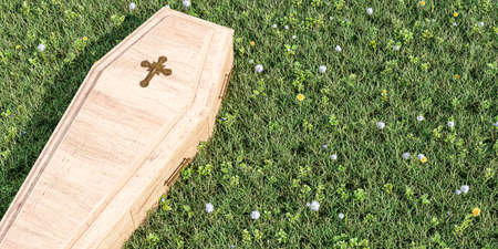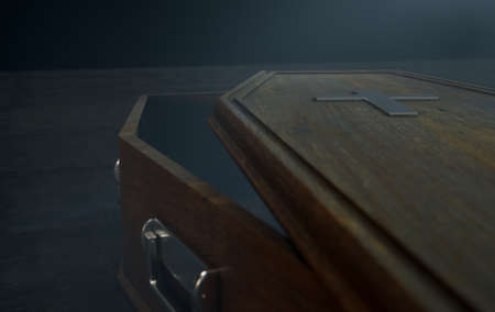 A slightly open empty wooden coffin with a metal crucifix and handles on a dark ominous background - 3D Render