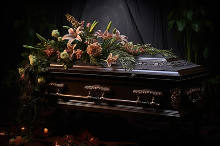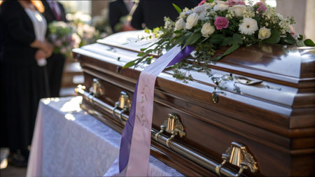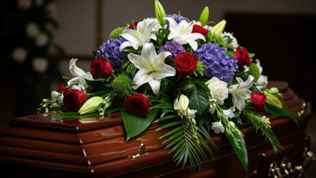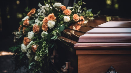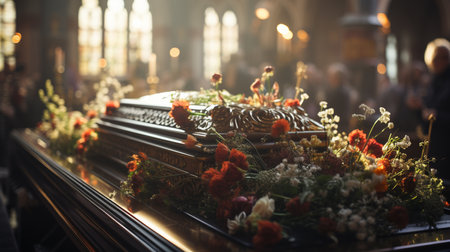 Emotional farewell at a funeral service with a beautifully arranged floral tribute on a polished wooden casket in a solemn atmosphere