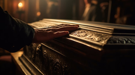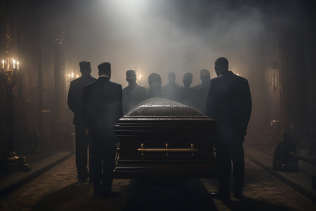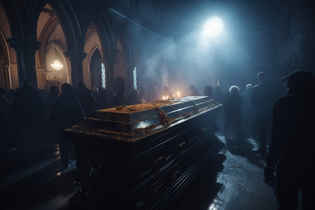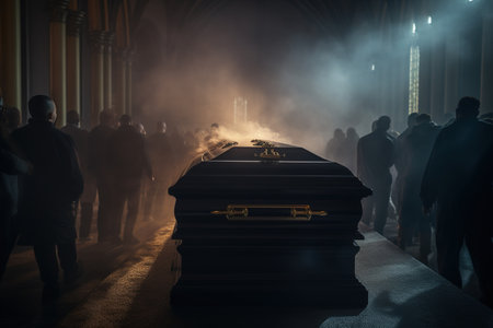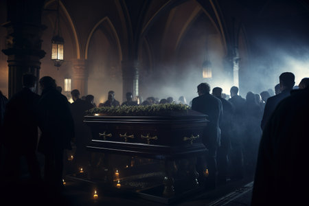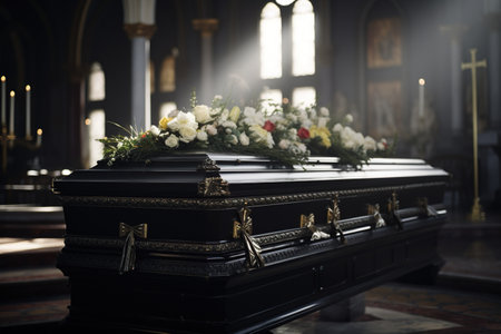 the subject noun is photo.a photo capturing the serene and peaceful ambiance of a funeral, with a dark amber and beige color palette. the meticulously detailed composition showcases luxurious textures, evoking a sense of prairiecore and classical academic aesthetics. the image transports viewers to a sanctuary of reflection and remembrance. ai generated