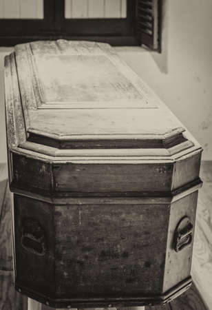 Coffin in a church during a funeral or burial of dead or alive person at night with copy space. Selective focus