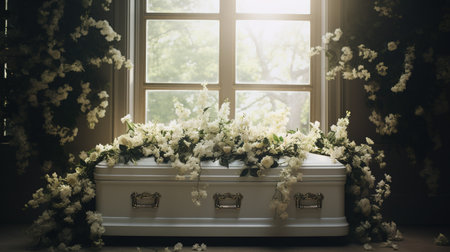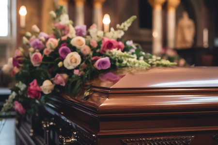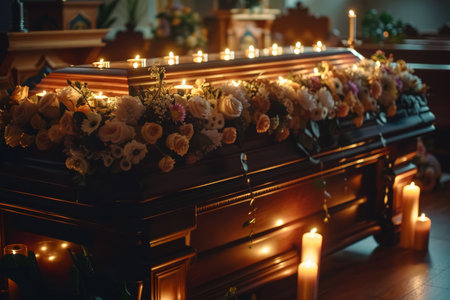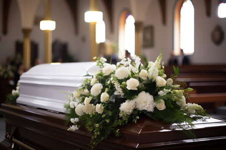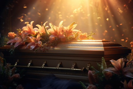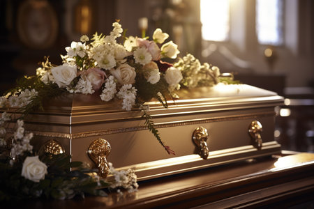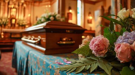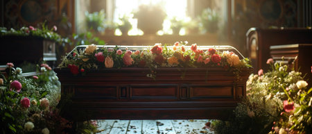 Delicate floral displays adorn a wooden casket, bathed in gentle light within a sacred space, evoking a mood of reverence and quiet mourning.