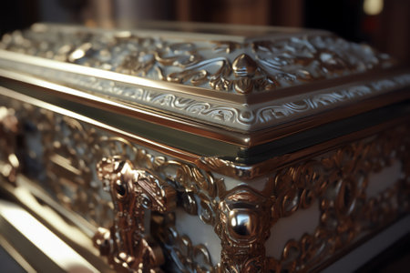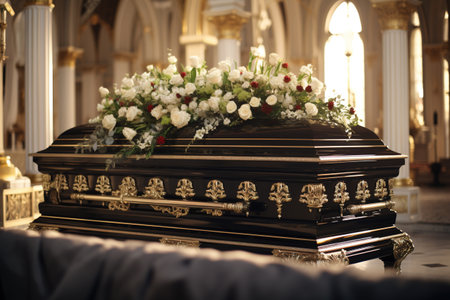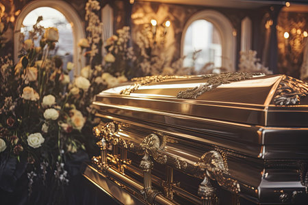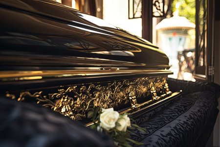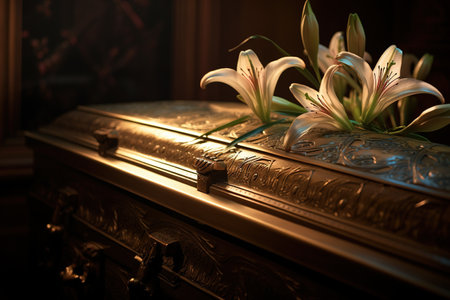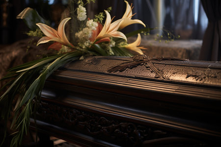 Generative AI closeup shot of a funeral casket in a hearse or chapel or burial at cemetery